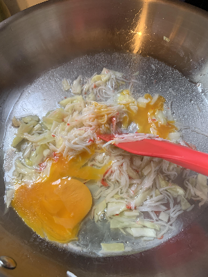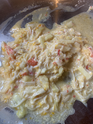 어제저녁에 신랑 친구분을 초대해서 파스타를 만들어 먹고 남은 게살을 이용해
