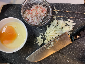 재료들을 잘게 다져준다. 게살은 가위로 잘라주었다.