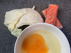 양배추를 깨끗이 씻고, 달걀을 미리 깨놨다.