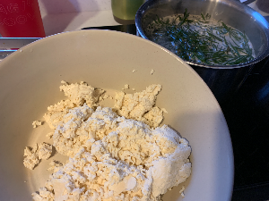 먼저 두부 한 모를 데쳐서 물기를 꽉 짠 뒤에 볼에 담아준다.