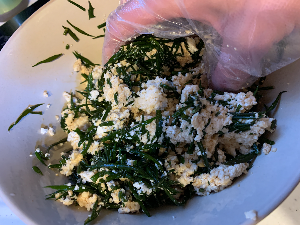 데친 톳은 깨끗하게 헹궈서 물기를 꽉 짠 뒤 두부를 담은 볼에 같이 넣어준다.
