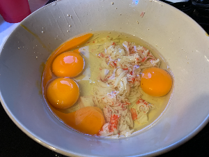 알끈을 제거한 계란 4알과 끓는 물에 데친 게살을 볼에 담아준다.