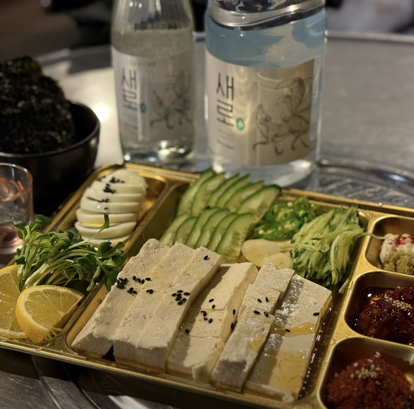 철판 위에 올려진 ‘버터구이 새우’는 소금 살짝에 버터 향이 더해져, 첫입부터 미소가 번졌다. 바삭한 오징어튀김, 고소한 계란말이, 그리고 마늘 듬뿍 들어간 제육볶음까지. 하나같이 손맛이 진하고 술맛을 당겼다.