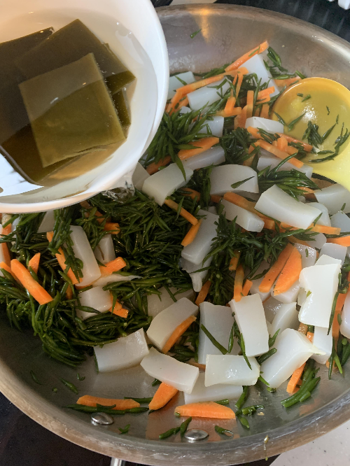4. 충분히 예열한 팬에 당근과 곤약을 먼저 넣고 볶다가 곤약에 기름 코팅이 될 정도가 되면톳을 넣고 함께 볶아준다.