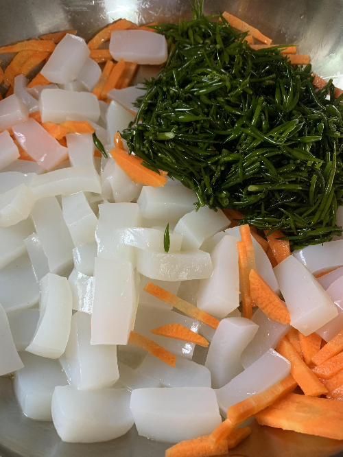 2. 곤약도 차가운 물에 깨끗이 씻은 후 끓는 물에 데쳐준다.처음 곤약을 요리에 사용해보는데 껍질 벗기는데 깜짝 놀랬다. 냄새가 너무 이상해서....ㅋㅋ그래서 끓는 물에 제법 오래 삶았다(?).그리고 건져내서 역시 차가운 물에 헹궈준 후, 먹기 좋게 잘라준다.나는 처음 요리해보는거라 또 잘 모르고... 채썰면 다 끊어질까봐 네모로 잘랐는데 채썰어도 될듯.