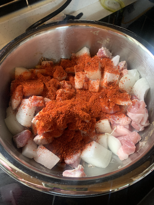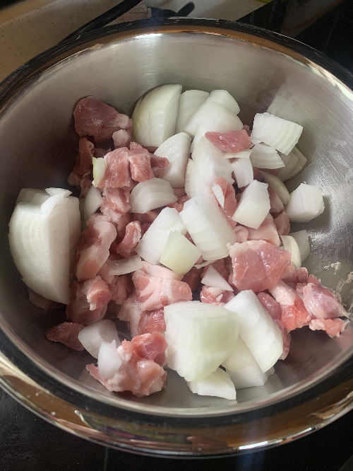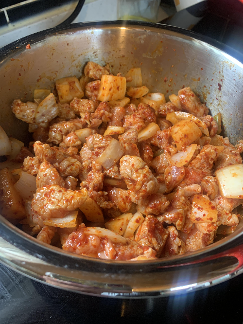 1. 충분히 예열한 미스뚝에 기름을 두르고 적당한 크기로 자른 돼지고기와 양파2개를 깍둑썰어서 볶는다.