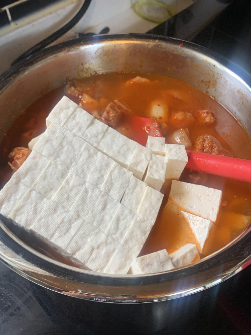 3. 충분히 볶아준다가 고기가 다 익은 것 같으면 물을 넣고 두부를 바로 넣어준다.