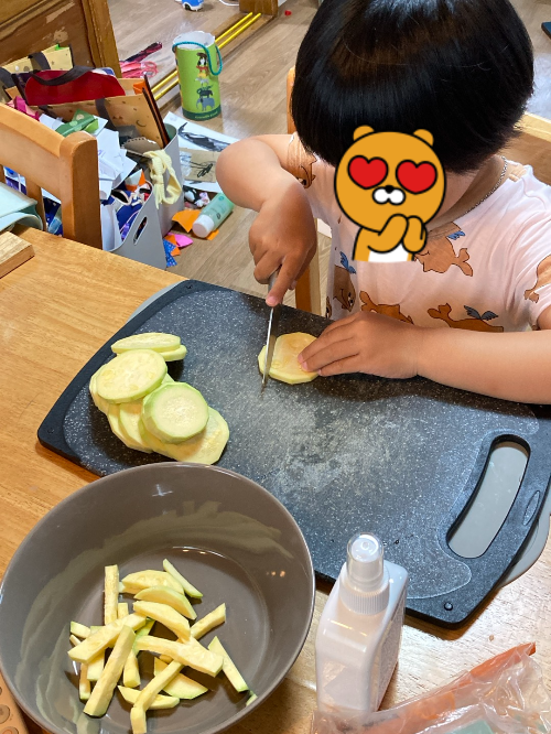 애호박을 선물받아 지안이와 같이 채썰어서 전으로 부쳐먹었다.