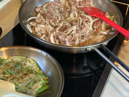 돼지 앞다리살로 만든 불고기와 미나리전, 멸치볶음으로 맛있게 먹었던 한 끼.