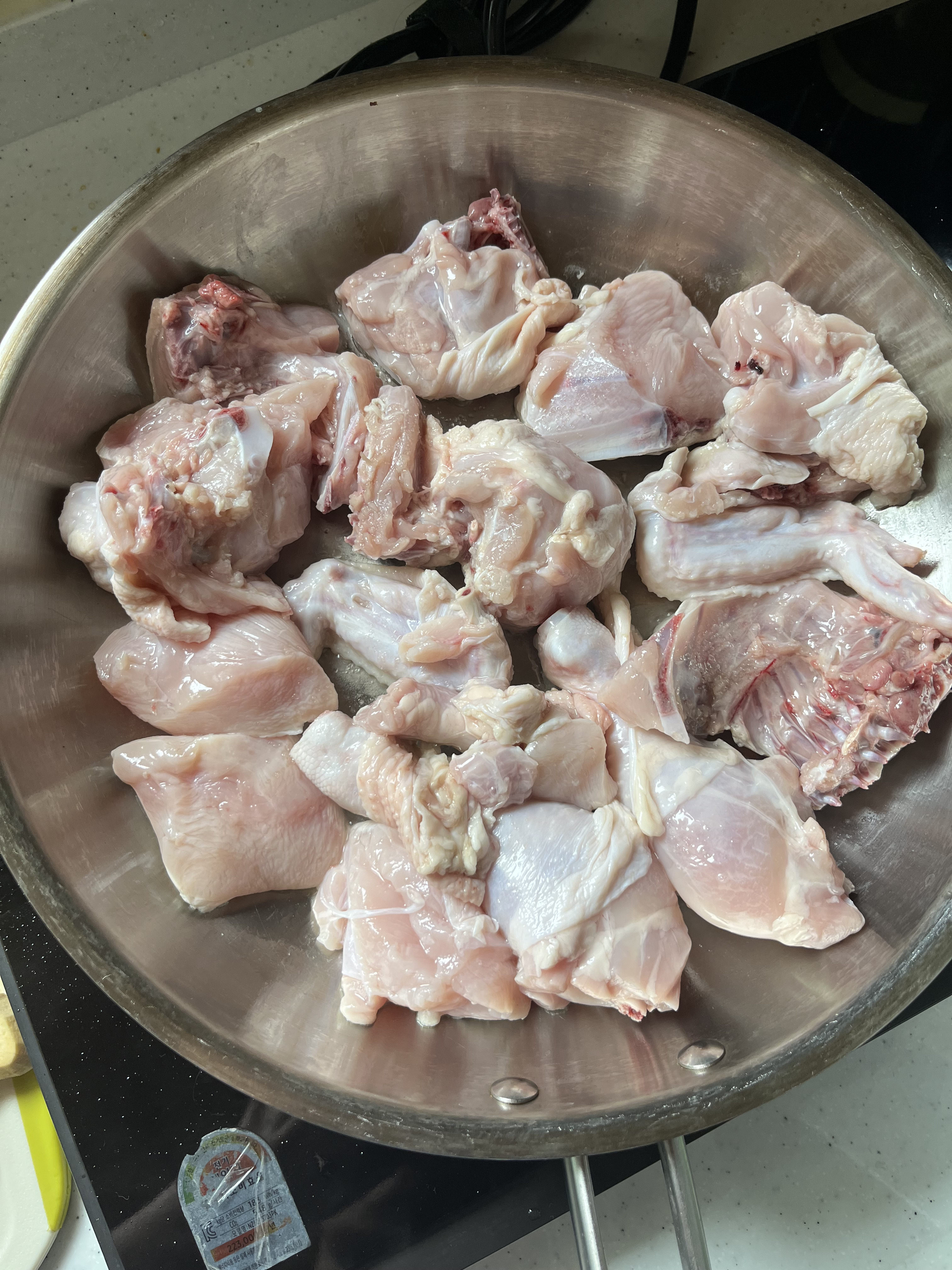 본격 요리에 들어갑니다. 물에 담궈 놓은 닭은 물기를 털어내주어서
