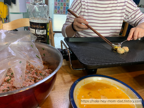꼬치 전과 애호박 전, 배추 전을 완성하고 점심 먹고 동그랑땡을 만들었다.