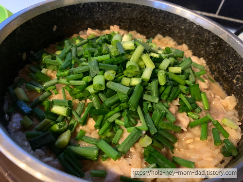 5. 8분 뒤 인덕션 불을 끄고 쪽파를 넣고 뚜껑을 닫아서 10분정도 뜸을 들인다.