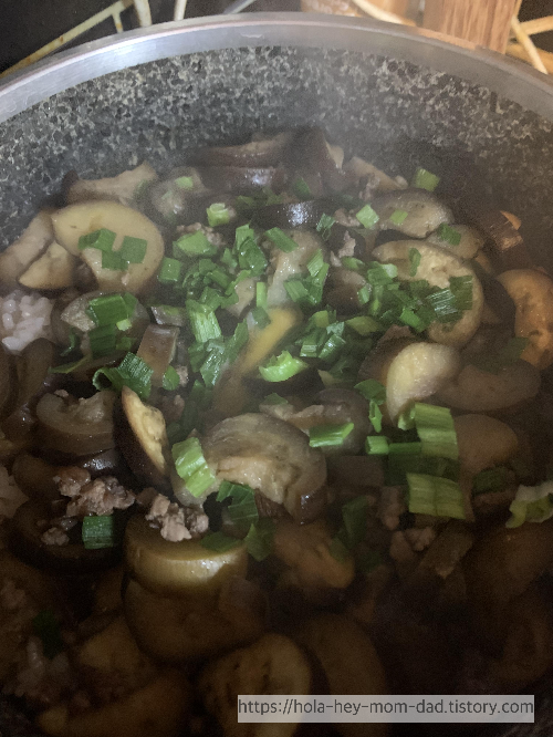 4. 볶은 소고기와 가지를 넣고 뚜껑을 닫은 뒤 8분.