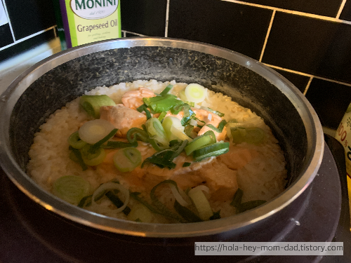 돌솥이나 무쇠솥이 없다면 그냥 일반 밥솥에 "무쇠솥밥" 메뉴로 해도 아주 그럴듯하다.